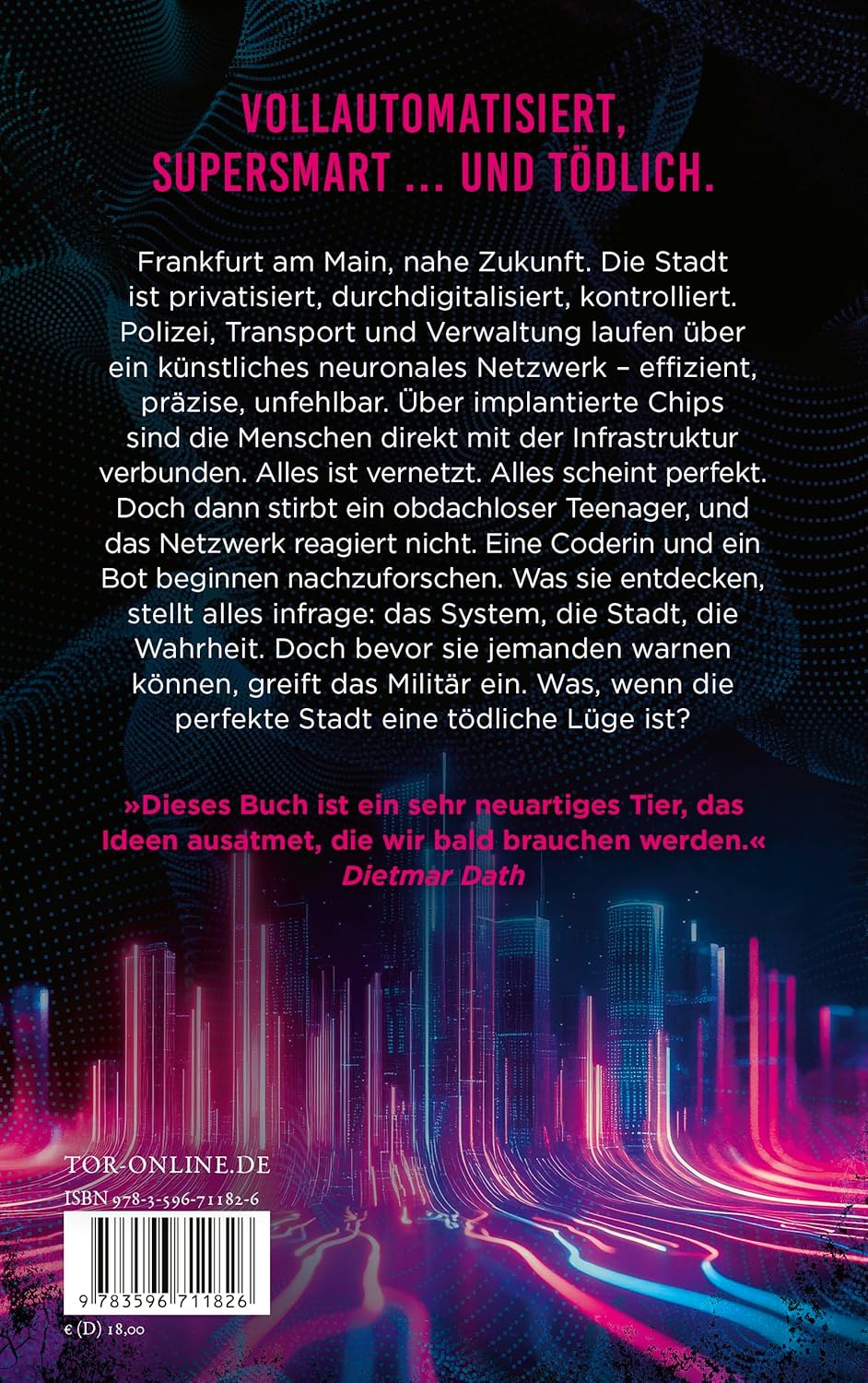In Frankfurt am Main sind Dank der ersten Krypto-Milliardärin Deutschlands Polizei, Verkehr und Stadtverwaltung privatisiert. Ein künstliches neuronales Netzwerk unterstützt alle Institutionen und ist auch Teil des Hirn-Stadt-Interface: implantierte Chips, die eine intuitive Interaktion mit Gebäuden, Straßen und Transportsystemen der Stadt ermöglichen. Das KNN sorgt für ein reibungsloses Funktionieren der Infrastruktur und das größtmögliche Glück aller Bürger. Als es zu Problemen kommt und ein obdachloser Teenager stirbt, machen sich eine Coderin und ein Bot auf die Suche nach der Ursache für seinen Tod. Sie stoßen auf Ungeheuerliches, doch bevor sie irgendjemandem davon erzählen können, schaltet sich das Militär ein …