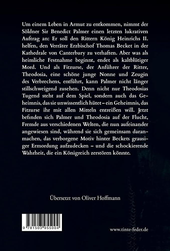 Um einem Leben in Armut zu entkommen, nimmt der Söldner Sir Benedict Palmer einen letzten lukrativen Auftrag an: Er soll den Rittern König Heinrichs II. helfen, den Verräter Erzbischof Thomas Becket in der Kathedrale von Canterbury zu verhaften. Aber was als heimliche Festnahme beginnt, endet als kaltblütiger Mord. Und als Fitzurse, der Anführer der Ritter, Theodosia, eine schöne junge Nonne und Zeugin des Verbrechens, entführt, kann Palmer nicht länger stillschweigend zusehen. Denn nicht nur Theodosias Tugend steht auf dem Spiel, sondern auch das Geheimnis, das sie unwissentlich hütet – ein Geheimnis, das Fitzurse ihr mit allen Mitteln entreißen will. Jetzt befinden sich Palmer und Theodosia auf der Flucht, Fremde aus verschiedenen Welten, die nun aufeinander angewiesen sind, während sie sich gemeinsam daran machen, das verborgene Motiv hinter Beckets grausiger Ermordung aufzudecken – und die schockierende Wahrheit, die ein Königreich zerstören könnte.