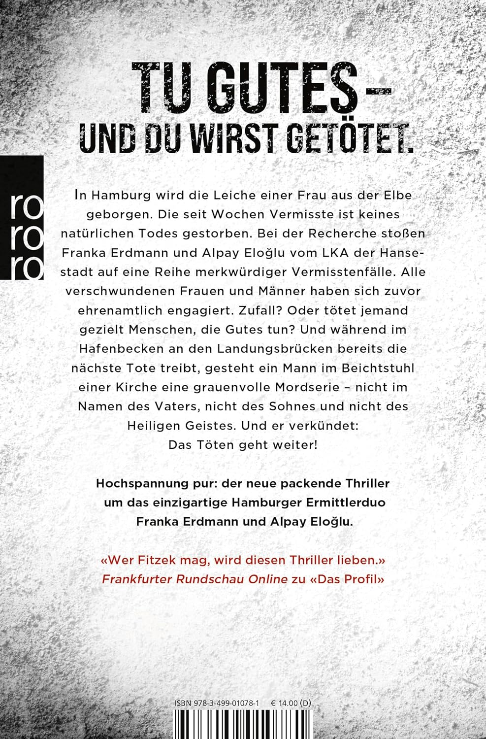 In Hamburg wird die Leiche einer Frau aus der Elbe geborgen. Die seit Wochen vermissten ist kein natürlicher Tod gestorben. Bei der Recherche stoßen Franka Erdmann und Alpay Eloğlu vom LKA der Hansestadt auf eine Reihe merkwürdiger Vermisstenfälle. Alle verschwundenen Frauen und Männer haben sich zuvor ehrenamtlich engagiert. Zufall? Oder tötet jemand gezielt Menschen, die Gutes tun? Und während im Hafenbecken an den Landungsbrücken bereits die nächste Tote treibt, gesteht ein Mann im Beichtstuhl einer Kirche eine grauenvolle Mordserie – nicht im Namen des Vaters, nicht des Sohnes und nicht des Heiligen Geistes. Und er verkündet: Das Töten geht weiter!