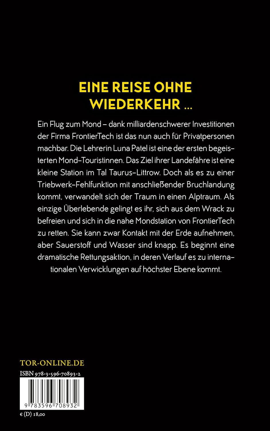 Ein Flug zum Mond – dank milliardenschwerer Investitionen der Firma FrontierTech ist das nun auch für Privatpersonen machbar. Die Lehrerin Luna Patel ist eine der ersten begeisterten Mond-Touristinnen. Das Ziel ihrer Landefähre ist eine kleine Station im Tal Taurus-Litrow. Doch als es zu einer Triebwerk-Fehlfunktion mit anschließender Bruchlandung kommt, verwandelt sich der Traum in einen Alptraum. Als einziges Überlebende gelingt es ihr, sich aus dem Wrack zu befreien und sich in der nahen Mondstation von FrontierTech zu retten. Sie können zwar Kontakt mit der Erde aufnehmen, aber Sauerstoff und Wasser sind knapp. Es beginnt eine dramatische Rettungsaktion, in deren Verlauf es zu internationalen Entwicklungen auf höchster Ebene kommt.