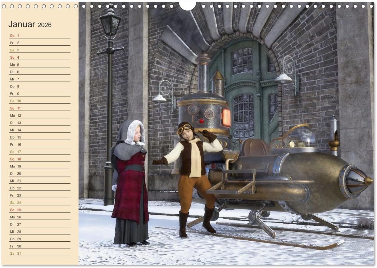Ein Computer von 1880 oder ein dampfbetriebener Schlitten wecken Ihr Interesse? Dann ist der Begleiter dieses Jahr ein absolutes Muss. Zwölf mutige und etwas verrückte Bastler und Erfinder wollen mit ihren Erkenntnissen und Maschinen die Steasmpunkwelt bereichern und euch jeden Monat aufs Neue zum Staunen und Schmunzeln bringen. Hochwertiger Wandkalender mit 12 wunderschönen Bildern.